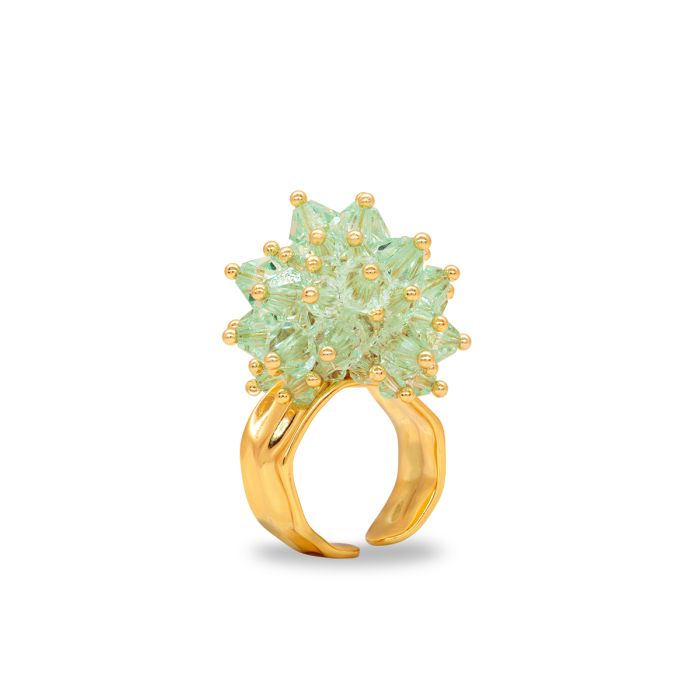 Minty Mintz -sormus on 18k kullalla päällystettyä 925 sterling-hopeaa ja kullattuihin messinkipinneihin rullattuja lasikristalleja. Sormuksen koko on säädettävä, joten se sopii jokaiselle.