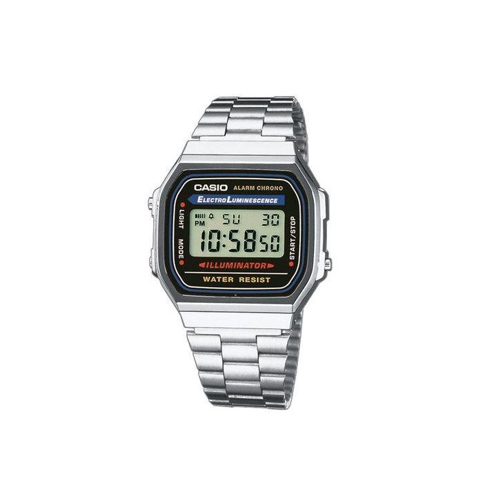 Casio Collection Retro kello, jossa ominaisuuksina taustavalo, ajanotto, hälytys, automaattinen kalenteri ja 12/24h. Casion kelloilla on kahden vuoden takuu.