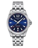 Certina DS Action naisten rannekello teräsrannekkeella. Kellossa on kvartsikoneisto ja naarmuuntumaton safiirilasi. Selkeässä sinisessä kellotaulussa on päivyri ja luminoidut indeksit ja viisarit.