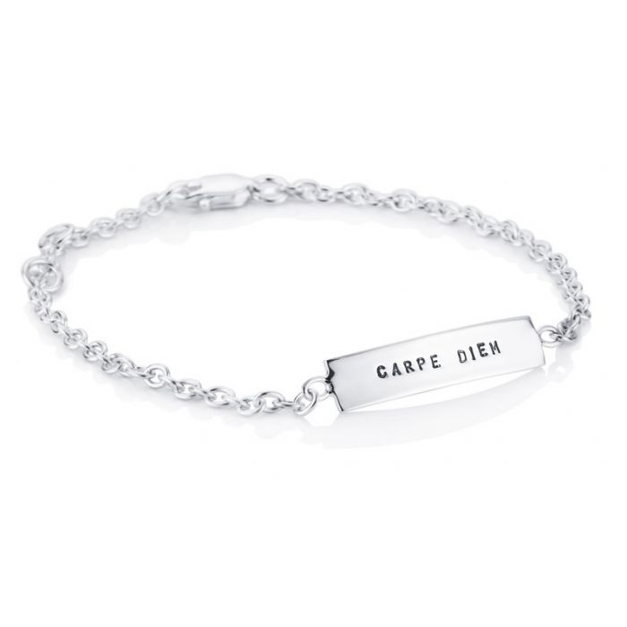 Hopea rannekoru säädettävällä ketjulla 15-18cm. Rannekorun laatassa lukee ”Carpe Diem”.