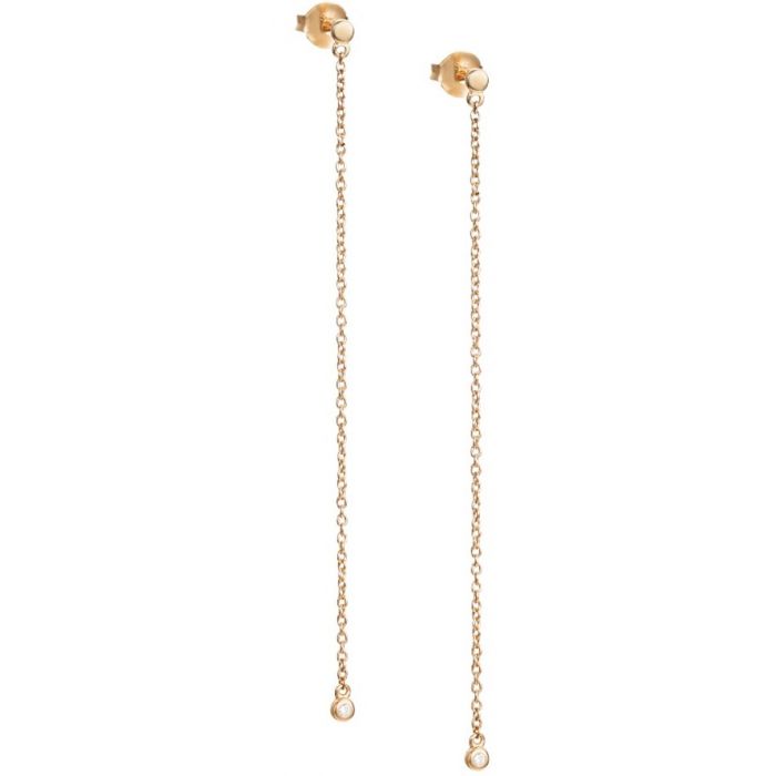 18 karaatin kullasta valmistetut korvakorut tappikiinnityksellä. Korvakorut laskeutuvat kauniisti 73mm ketjun ansiosta. Ketjun päissä on yksityiskohtana 0,01ct timantit.
