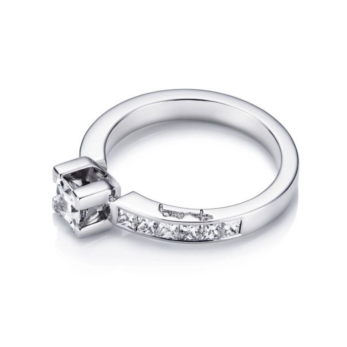 18 karaatin valkokullasta valmistettu timattisormus. Vahvassa rungossa 12*0.64ct timantteja ja keskitimantti näyttävä 0.50ct.