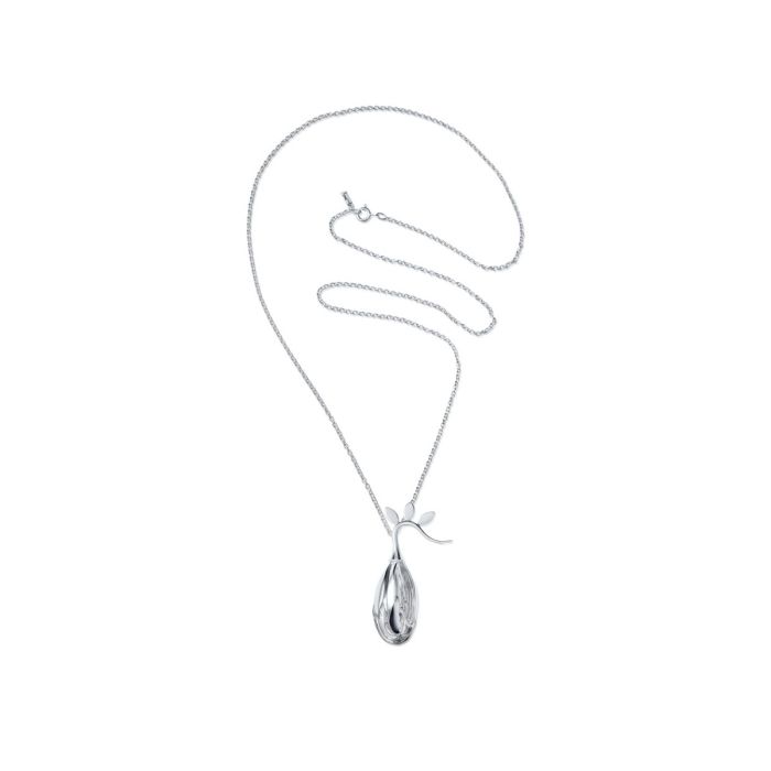 Kierrätetystä sterlinghopeasta valmistettu kaulakoru. Freesiankukan muotoinen riipus. Riipuksen kokonaispituus: 56 mm, leveys: 17,5 mm.