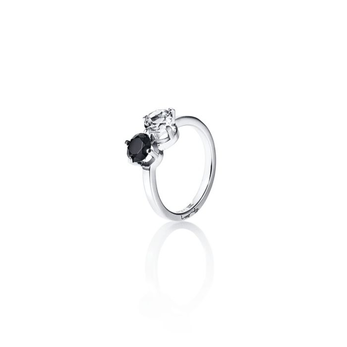 Ihana hopeinen sormus, jossa kirkas vuorikristalli ja musta onyksi. Samaan sarjaan kuuluu myös korvakorut ja riipus.