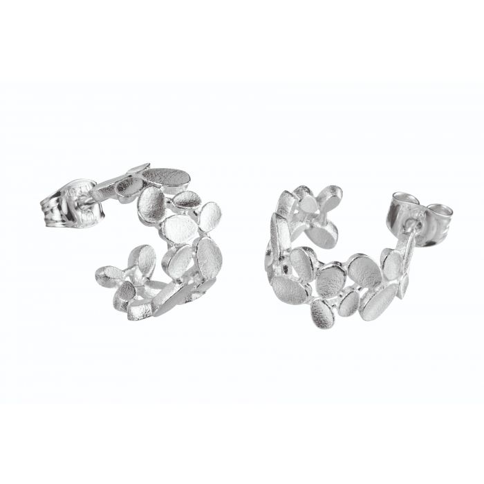 Haaveista totta. Rengasmaisten hopeisten Haave-korvakorujen pienistä mattapintaisista silmuista muodostuu herkkä pitsimäinen kudelma. Tappikiinnitys.