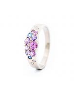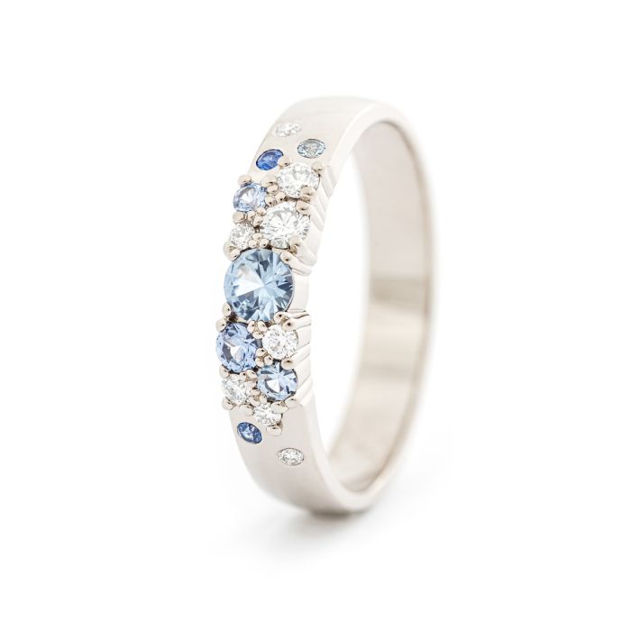 Keto 4mm Kevät sormuksessa on 8 kirkasta timanttia (yht. 0,17ct), laatuluokka tw/vs ja 7 pastellinsävyistä vaaleansinistä safiiria (0,34ct).