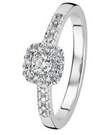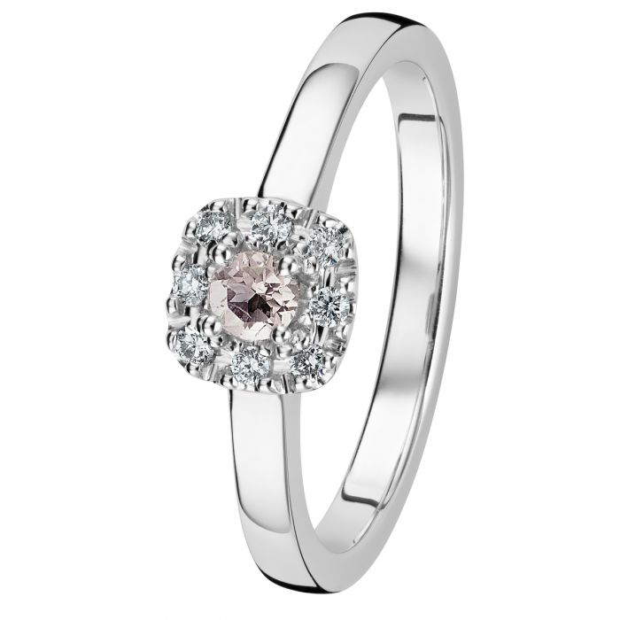 Kohinoor Valerie Cushion-sormus, jossa on cushion-muotoinen halo-istutus, jonka keskellä säihkyy kaunis 3mm morganiitti. Ympärillä 8 kappaletta 0,01ct timanttia. Sormuksen rungon leveys on 2,2mm.