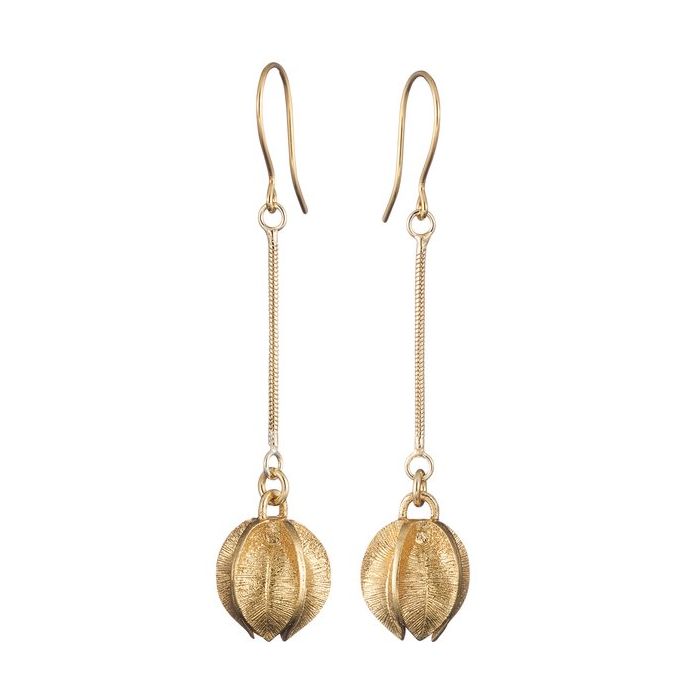 Lumikukka roikkuvat korvakorut koukuilla. Saatavilla myös hopeisena. Lumikukka on suomalaisen korumuotoilun moderni klassikko. Kirkkaasta pronssista valettu pallomainen Lumikukka hehkuu lämpimän kullanhohtoisena. Avokoukut kullattua hopeaa. Korvakorut saatavissa myös hopeisina.