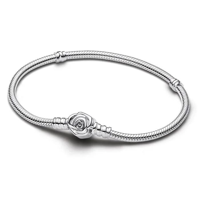 Tämä Pandora Moments -malliston sterlinghopeinen käärmeketjurannekoru huokuu romantiikkaa. Yksityiskohtainen luomus on enemmän kuin pelkkä koru – se on rakkaudenosoitus. Ruusulukon terälehtikerrokset tuovat koruun ripauksen kukkien eleganssia ja symboliikkaa. Monikäyttöiseen ja tyylikkääseen koruun mahtuu 16–18 helaa. Käytännölliset kierteet auttavat pitämään helat halutuissa kohdissa. Pujota ranteeseesi muistuttamaan elämääsi rikastuttavasta rakkaudesta tai anna lahjaksi läheiselle.
