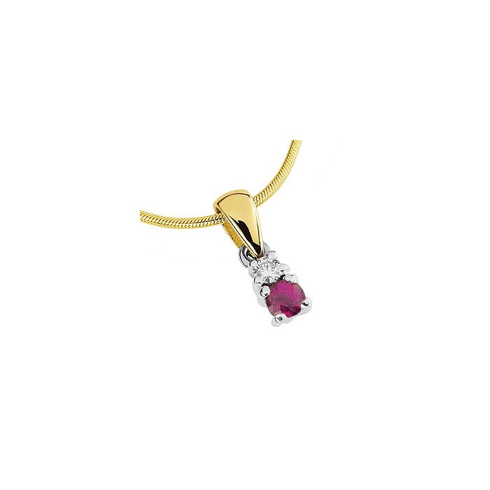 Valkokultainen timanttiriipus, jossa on 0,05ct timantti ja 3,1mm rubiini.