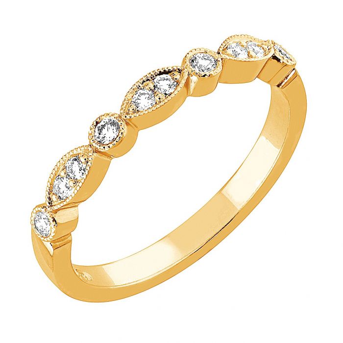 Sormuksen 10 timanttia, yhteispainoltaan 0,14 ct, on istutettu vanhan ajan romanttista tyyliä henkivään krysanttireunaiseen istutukseen.