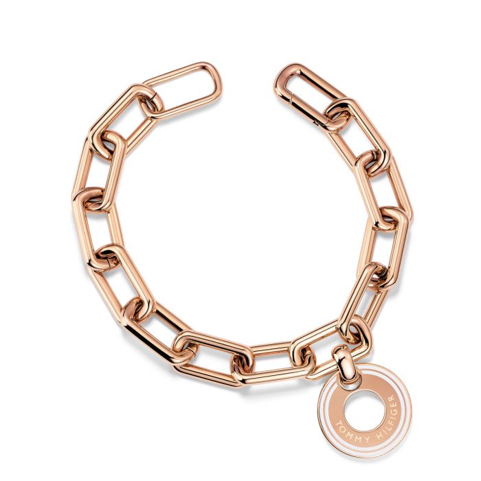 Erittäin muodikas naisten Tommy Hilfiger -rannekoru. Rannekoru koostuu pyöristettyjen suorakulmioiden muotoisista lenkeistä, joista yhdestä roikkuu pyöreä laattariipus kaiverruksella "Tommy Hilfiger". Materiaalina on käytetty laadukasta ruostumatonta terästä punakullan sävyssä. Upea statement-koru täydentämään asukokonaisuutta!