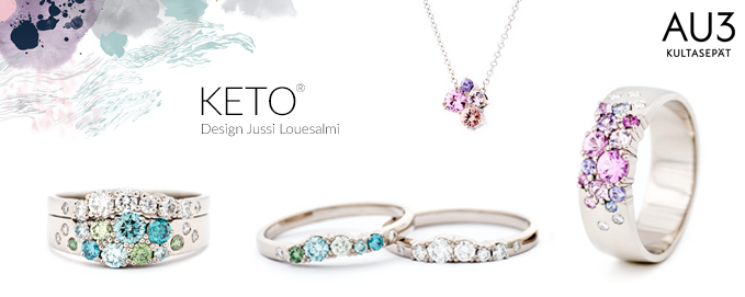 Kukkaniitystä inspiraatiota saaneen Keto-korumalliston muotokieli on runsas – epäsymmetrinen kivien asettelu ja huolella valitut värisävyt luovat kuitenkin herkän ja kevyen vaikutelman. Kotimainen, korkealaatuinen Keto sormus on täydellinen esimerkiksi vihkisormuksena, korvakorut ja kaulakoru täydentävät tyylin!